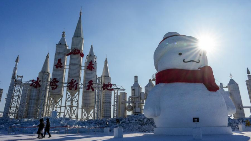 公園の巨大雪だるまが人気スポットに 中国・ハルビン