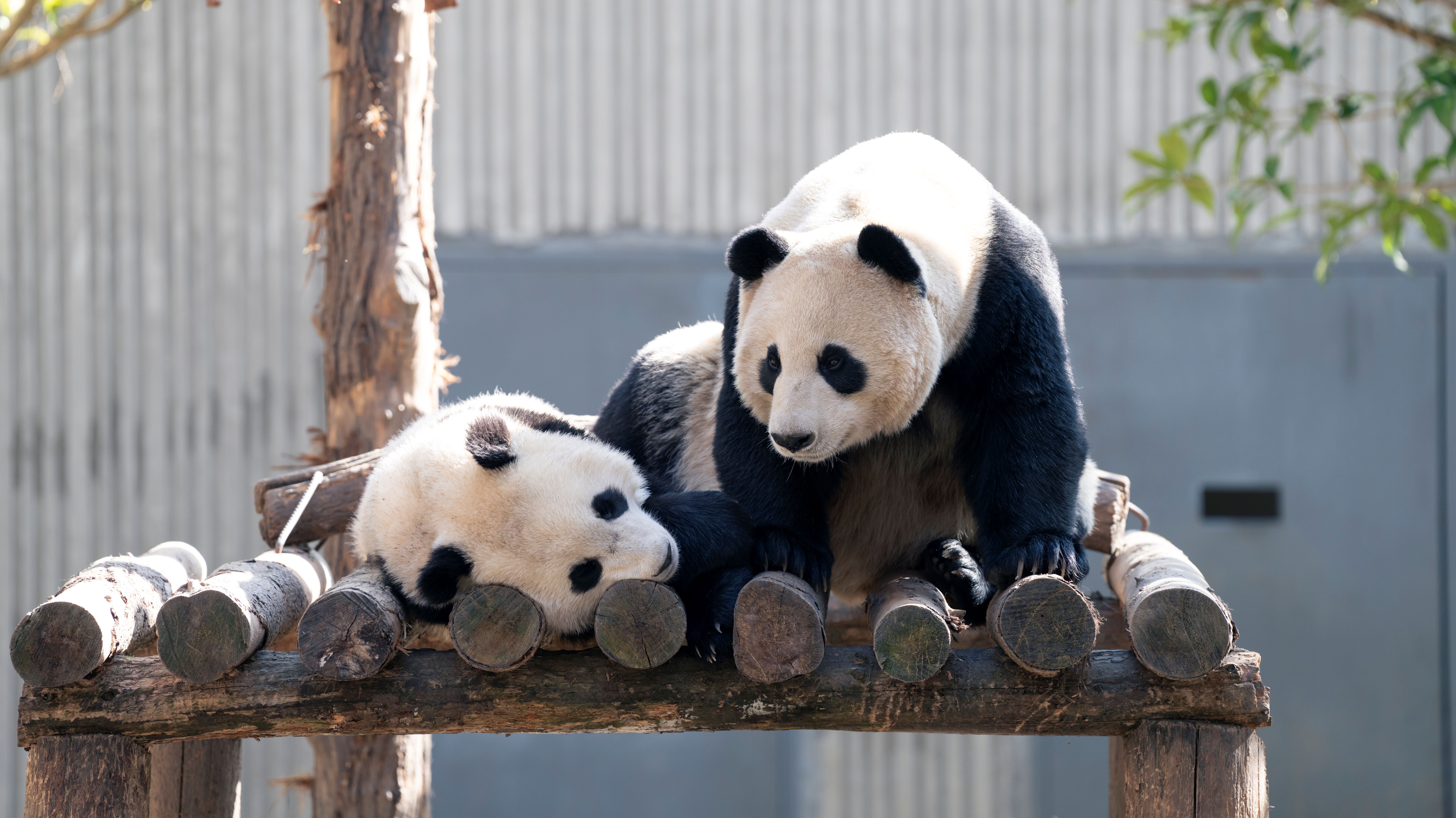 パンダの「珍珍」と「芊喜」、台の上でのんびり 中国四川省