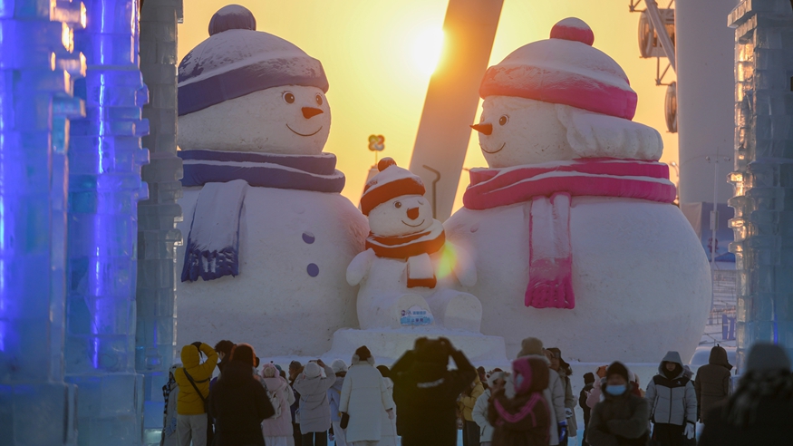 夕日に照らされるハルビン氷雪大世界 中国黒竜江省