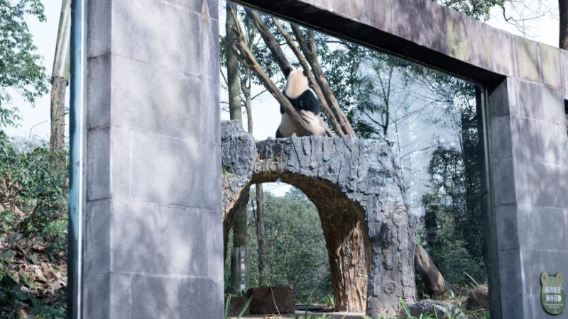 座るシャンシャン、後ろ姿きりり 中国四川省