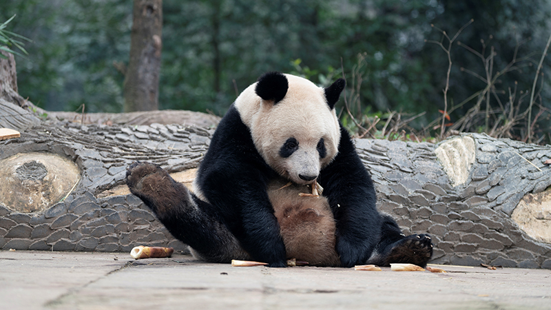 パンダのシャンシャン、タケノコを探す 中国四川省