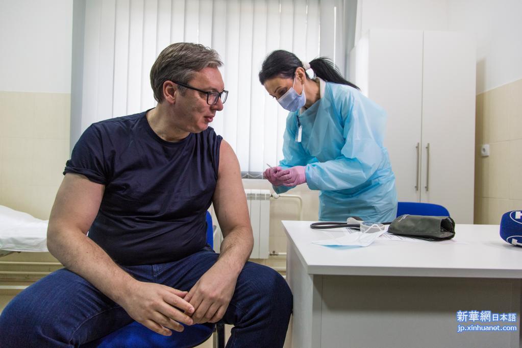 6日、セルビア・マイダンペック市で中国製ワクチンの接種を受けるブチッチ大統領。(マイダンペック=新華社記者/石中玉)