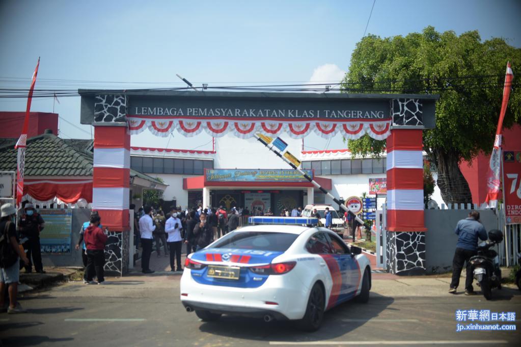 8日、インドネシア・タンゲランの刑務所に入る警察車両。(ジャカルタ=新華社配信)