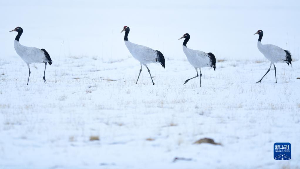 【新華社西寧11月1日】中国青海省ゴロク・チベット族自治州瑪多(ばた)県にある三江源国家公園の黄河源園区ではこのところ、餌を探す数羽のオグロヅルの姿が見られる。