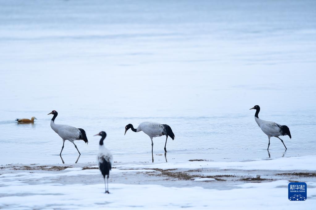 10月21日、三江源国家公園の黄河源園区に現れたオグロヅル。(瑪多=新華社記者/張竜)