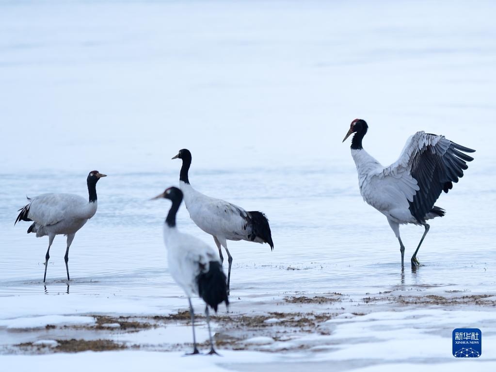 10月21日、三江源国家公園の黄河源園区に現れたオグロヅル。(瑪多=新華社記者/張竜)