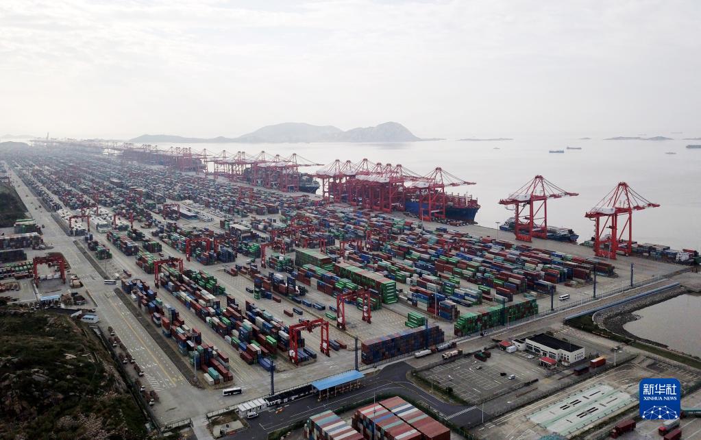3日、上海市洋山港のコンテナターミナル。(小型無人機から、上海=新華社記者/丁汀)