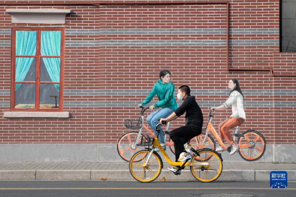 3日、上海の伝統建築が残る静安区の平徳里で、壁画の前を自転車で通る人。(上海=新華社記者/孟濤)