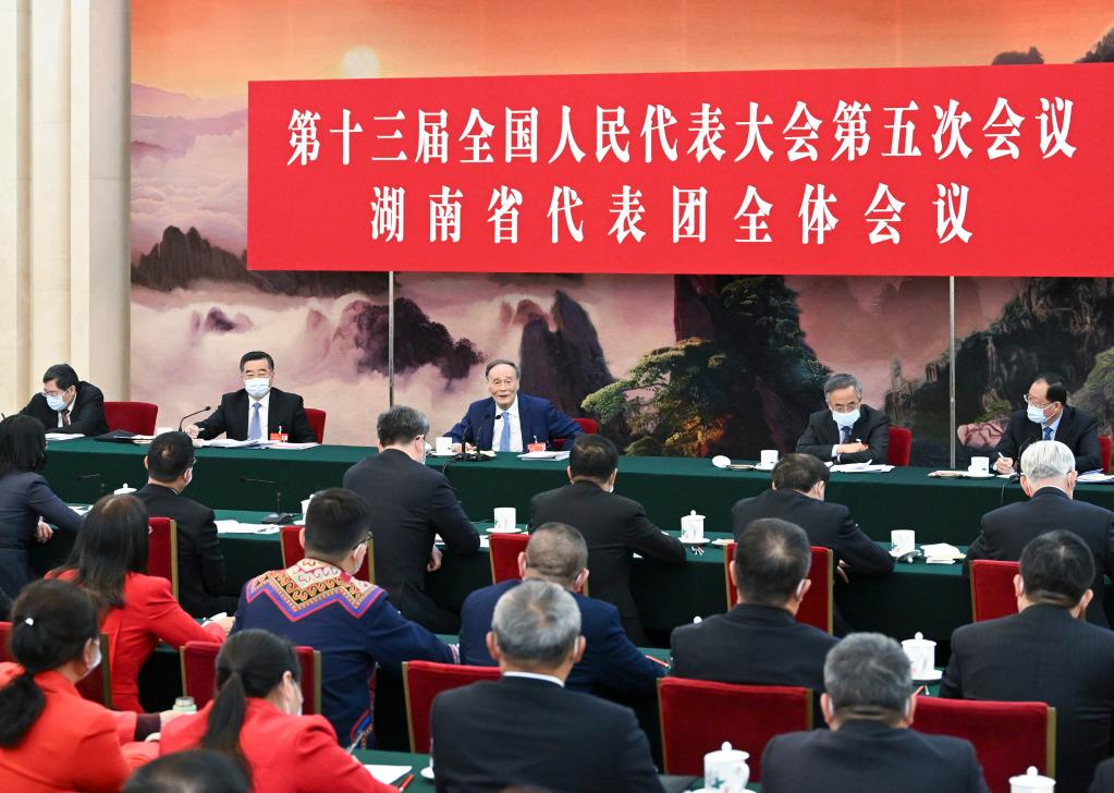 中国の王岐山(おう・きざん)国家副主席は5日、第13期全国人民代表大会(全人代)第5回会議湖南省代表団の審議に参加した。(北京=新華社記者/申宏)
