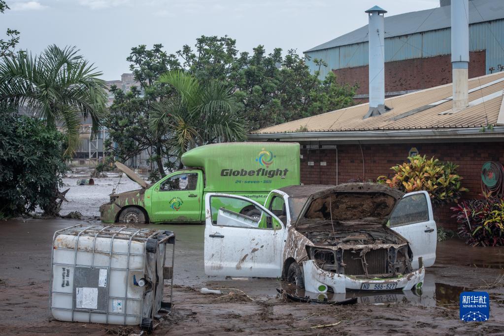 13日、南アフリカのクワズール・ナタール州で洪水により損壊した自動車。(クワズール・ナタール=新華社配信)