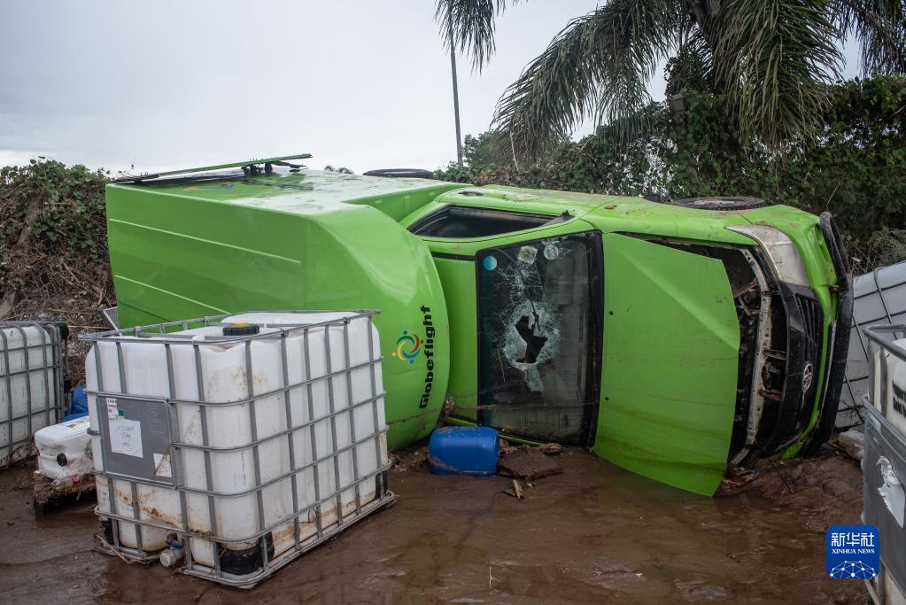 13日、南アフリカのクワズール・ナタール州で洪水により損壊した自動車。(クワズール・ナタール=新華社配信)