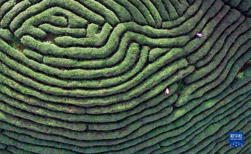 19日、勉県漆樹壩鎮の青坪山茶園で茶葉を摘む農家の人たち。(小型無人機から、漢中=新華社記者/陶明)