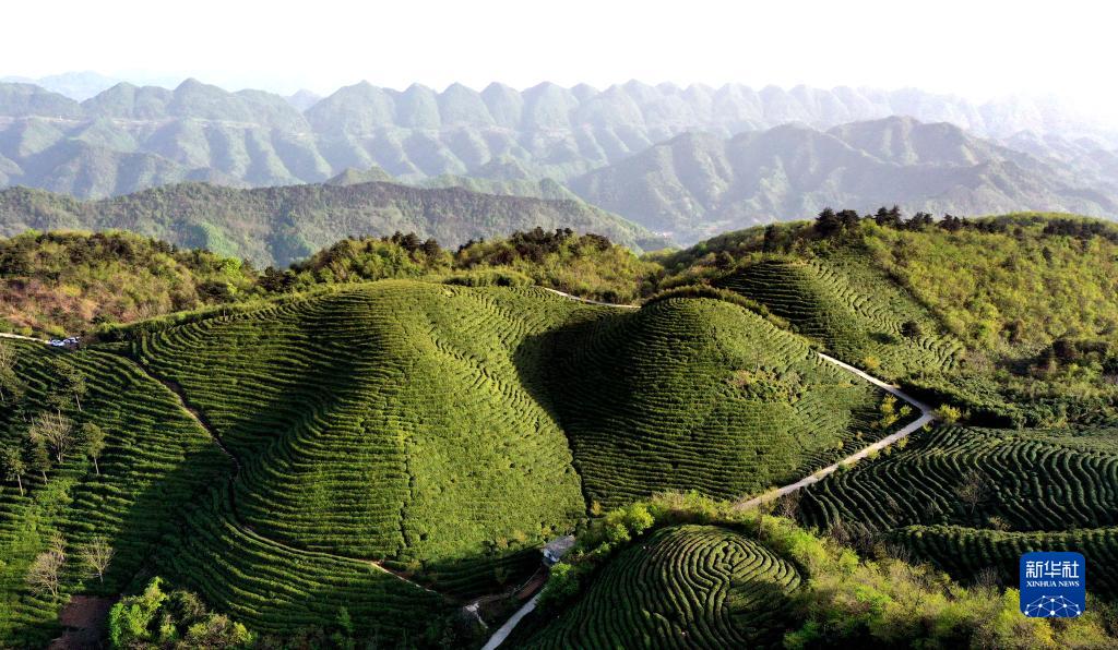 19日、空から見た勉県漆樹壩鎮の青坪山茶園。(小型無人機から、漢中=新華社記者/陶明)