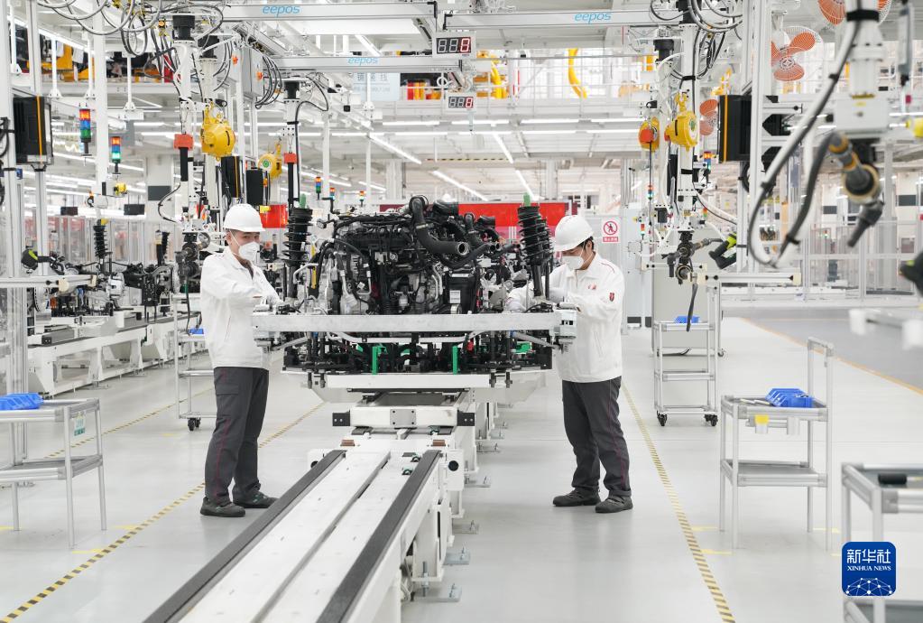 22日、一汽紅旗繁栄工場の生産ラインで作業する従業員。(長春=新華社配信)
