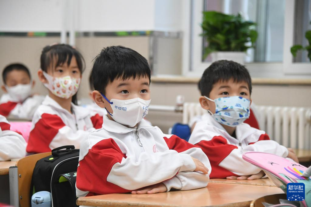 13日、新学期の授業を受ける中国人民大学付属中学実験小学校の児童たち。(北京=新華社記者/任超)pagebreak