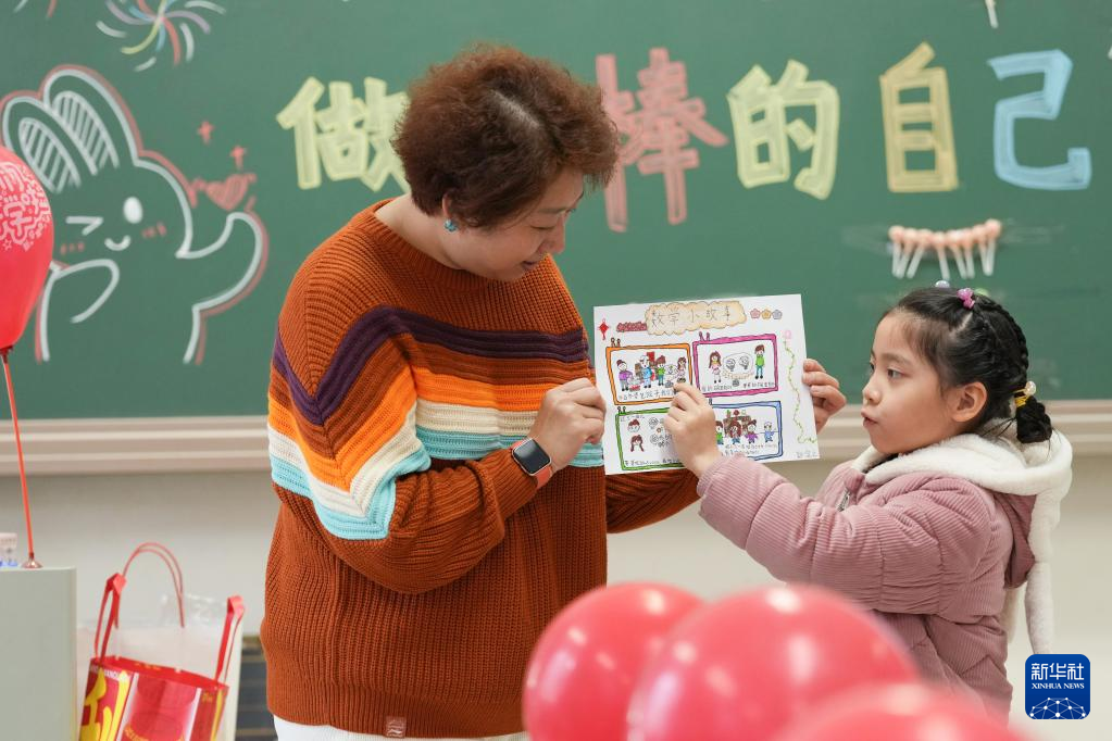 13日、北京市朝陽区の芳草地国際学校遠洋小学校で、冬休みの宿題を見せる児童。(北京=新華社記者/鞠煥宗)pagebreak