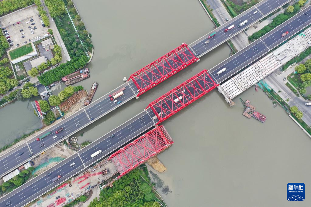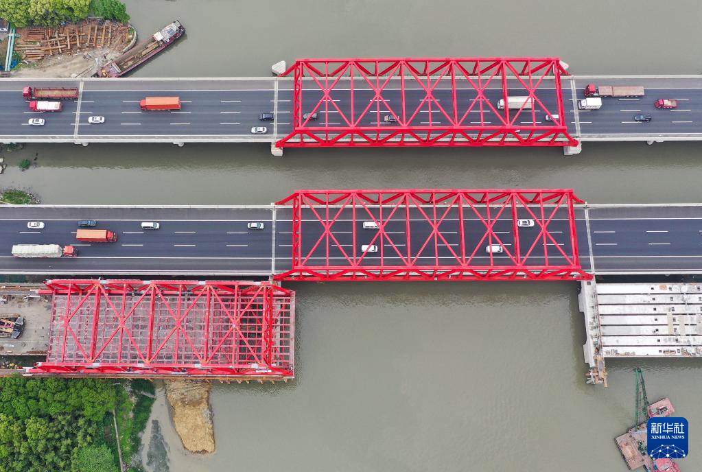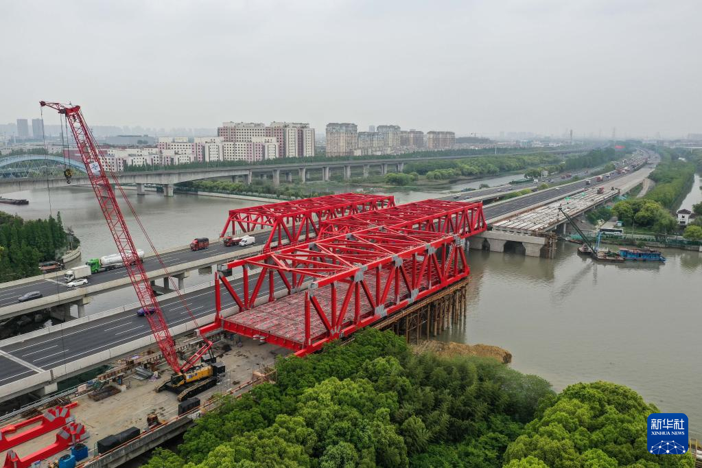 【新華社南京4月29日】中国の鉄道建設大手、中国中鉄傘下の中鉄二十局集団が建設を請け負う滬寧(こねい)高速道路(上海市-江蘇省南京市)の青陽港大橋改修プロジェクトは25日、南側鋼トラス桁の架設工事が実施された。プロジェクト完成後は青陽港の輸送能力が大幅に向上する。pagebreak