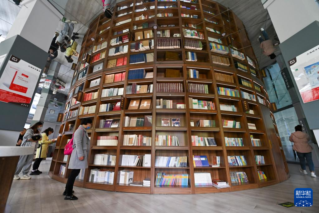4月27日、文瀛城市書房を訪れた来店客。(太原=新華社記者/楊晨光)