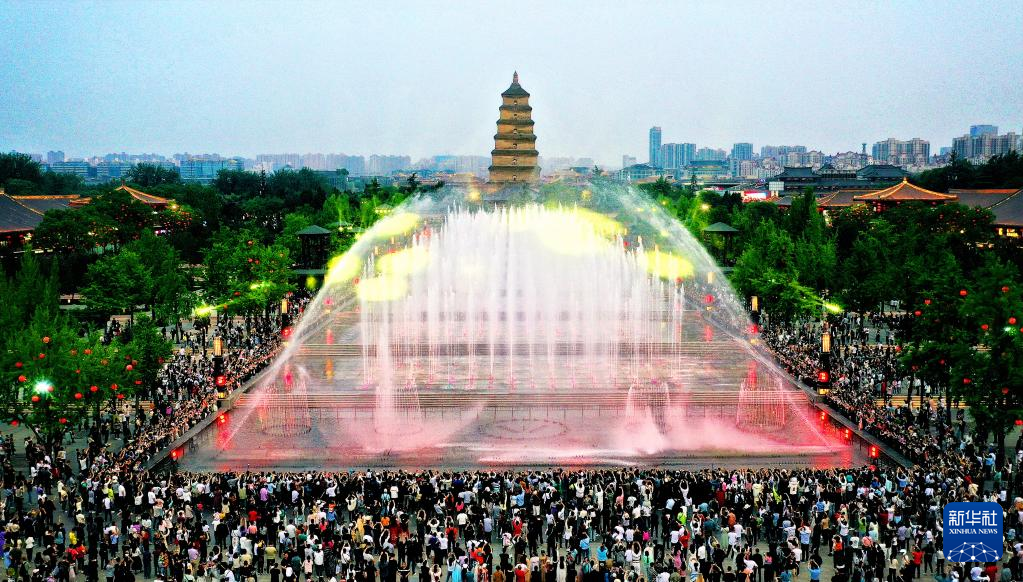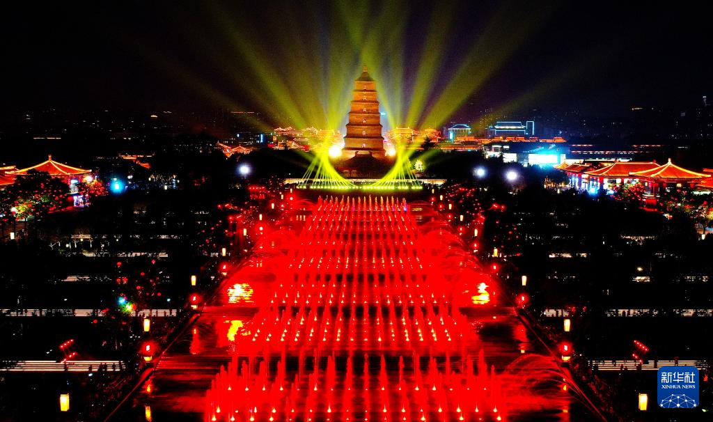 西安の大雁塔北広場で開かれた音楽噴水ショー。(4月18日、小型無人機から、西安=新華社記者/劉瀟)pagebreak