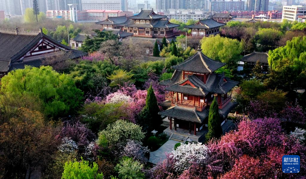 桜が満開となった青竜寺遺跡風景区。(3月31日、小型無人機から、西安=新華社記者/劉瀟)pagebreak
