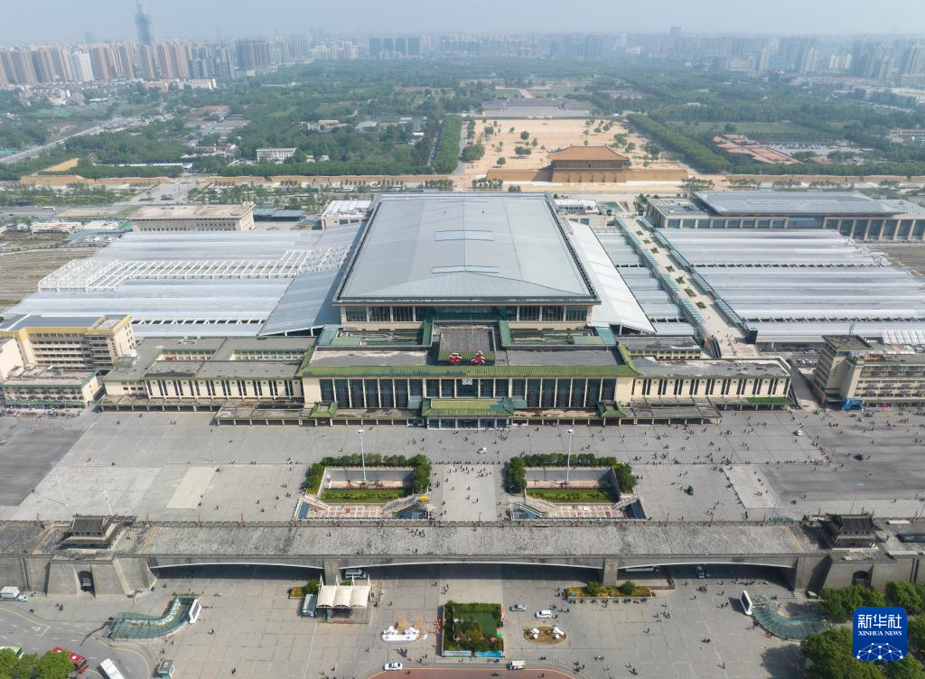 西安駅(手前)と大明宮国家遺跡公園。(4月25日、小型無人機から、西安=新華社記者/邵瑞)pagebreak