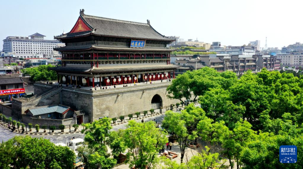 西安鼓楼。(4月25日、小型無人機から、西安=新華社記者/劉瀟)pagebreak