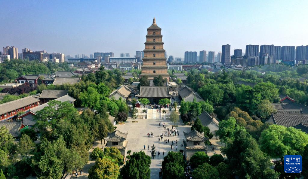 西安の大雁塔。(4月19日、小型無人機から、西安=新華社記者/劉瀟)pagebreak