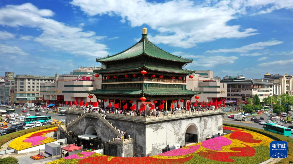 1日、西安鐘楼。(小型無人機から、西安=新華社記者/劉瀟)