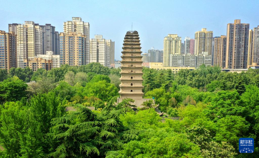 西安の小雁塔。(4月18日、小型無人機から、西安=新華社記者/劉瀟)pagebreak