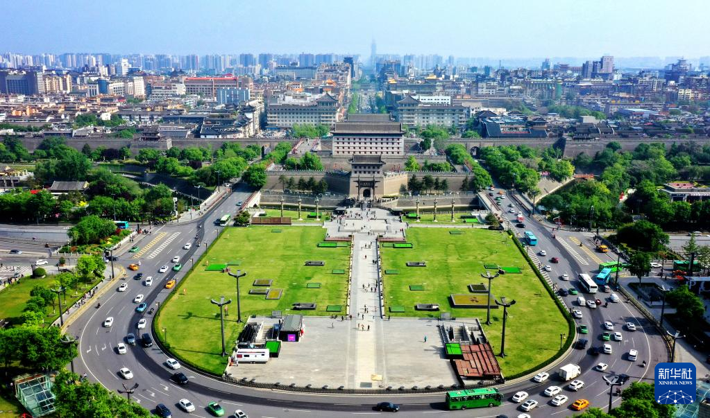 西安城壁景観区の永寧門文化広場。(4月25日、小型無人機から、西安=新華社記者/劉瀟)pagebreak