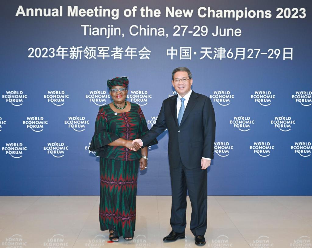 中国の李強(り・きょう)国務院総理は26日午後、世界貿易機関(WTO)のオコンジョイウェアラ事務局長と天津市で会見した。(天津=新華社記者/岳月偉)