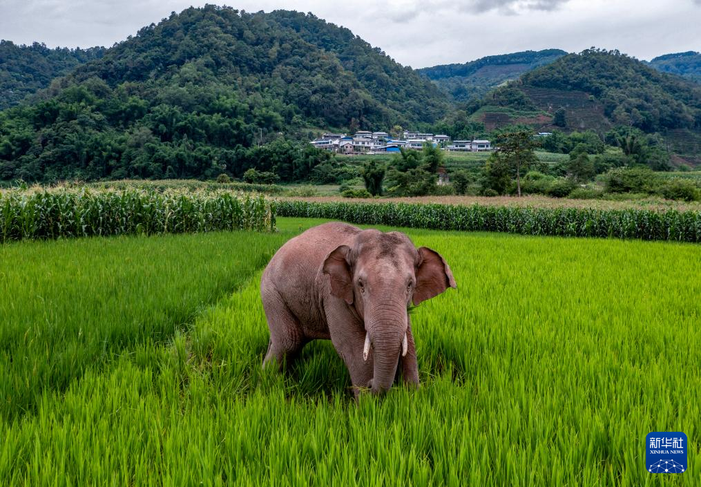 19日、田んぼで餌を食べるアジアゾウ。(普洱=新華社記者/費茂華)