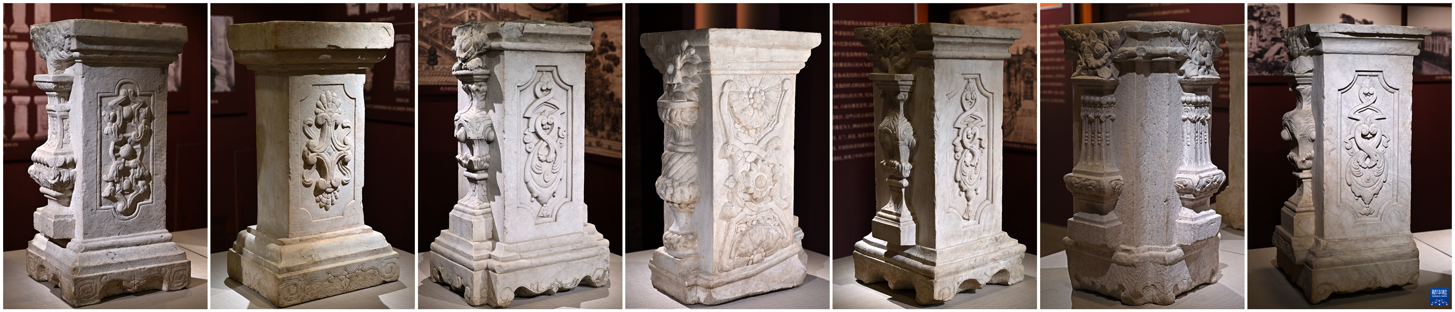 13日、円明園博物館に展示されている7本の石柱。(組み合わせ写真、北京=新華社記者/李鑫)