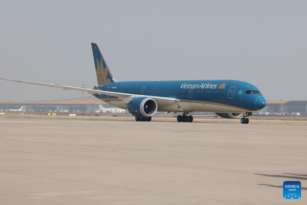 17日、ベトナムのボー・バン・トゥオン国家主席を乗せ、北京に到着した航空機。(北京=新華社記者/金立旺)