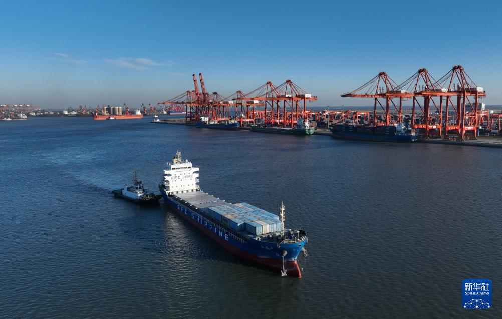21日、荷降ろしを終え、唐山港京唐港区のコンテナ埠頭(ふとう)を出港する貨物船。(小型無人機から、唐山=新華社記者/楊世尭)