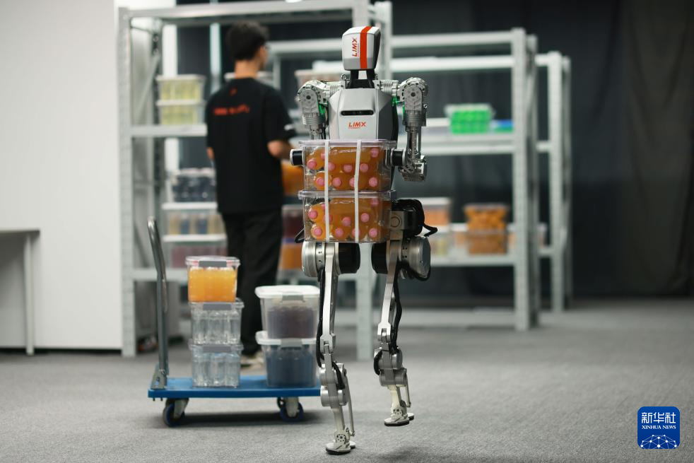 ロボットメーカーの深圳逐際動力科技で、高負荷の運搬作業をこなす人型ロボット「CL-1」。(深圳=新華社配信)pagebreak
