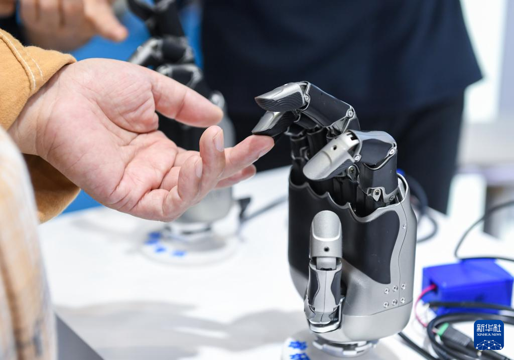 11月15日、広東省深圳市で開かれた中国国際ハイテク成果交易会で、深圳睿研智能控制のロボットハンドに触れる来場者。(深圳=新華社記者/毛思倩)