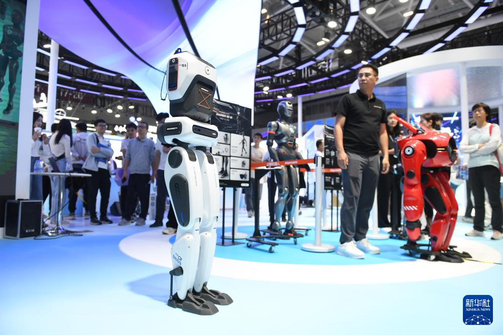11月14日、広東省深圳市で開かれた中国国際ハイテク成果交易会で、歩行能力を披露する深圳市衆擎機器人科技の二足歩行ロボット「SA01」。(深圳=新華社記者/毛思倩)