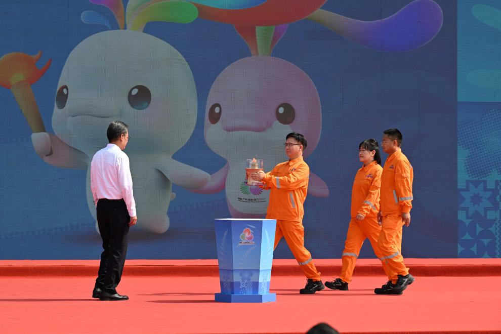 9日、採火式の会場に到着した聖火。(広州=新華社記者/鄧華)