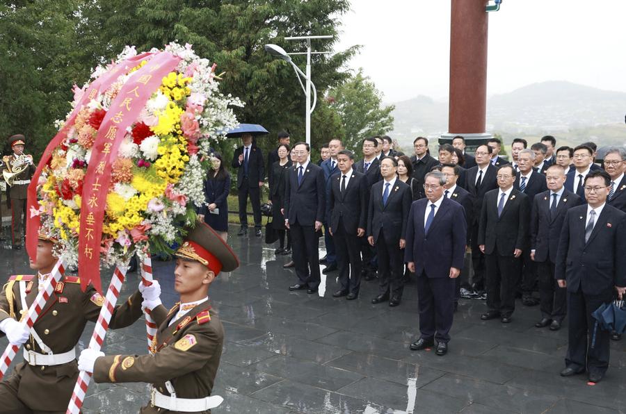 【新華社平壌10月11日】中国人民志願軍抗米援朝出国作戦75周年に際し、中国の李強(り・きょう)共産党中央政治局常務委員・国務院総理は10日午後、訪問先の朝鮮で平安南道安州市の中国人民志願軍烈士陵園を訪れ、烈士らを追悼した。