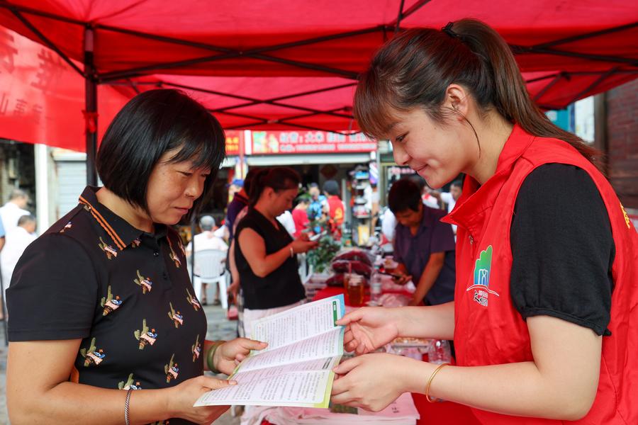 10日、視覚障害者(左)に就業先について説明する武夷山市職員。(武夷山=新華社配信/邱汝泉)