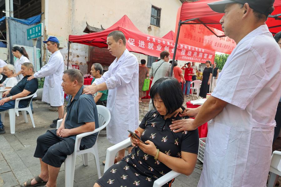10日、イベントで来場者に施術する視覚障害者のマッサージ師。(武夷山=新華社配信/邱汝泉)
