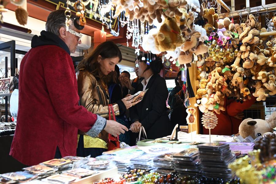 11日、敦煌市の沙州夜市を訪れた海外からの来賓。(敦煌=新華社記者/范培珅)