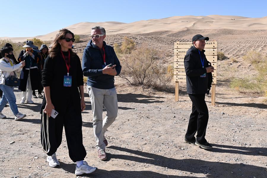 12日、莫高窟の風砂環境総合管理プロジェクトの現場を訪れた海外からの来賓。(敦煌=新華社記者/范培珅)