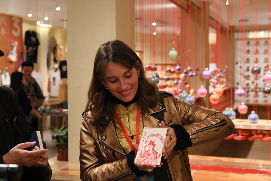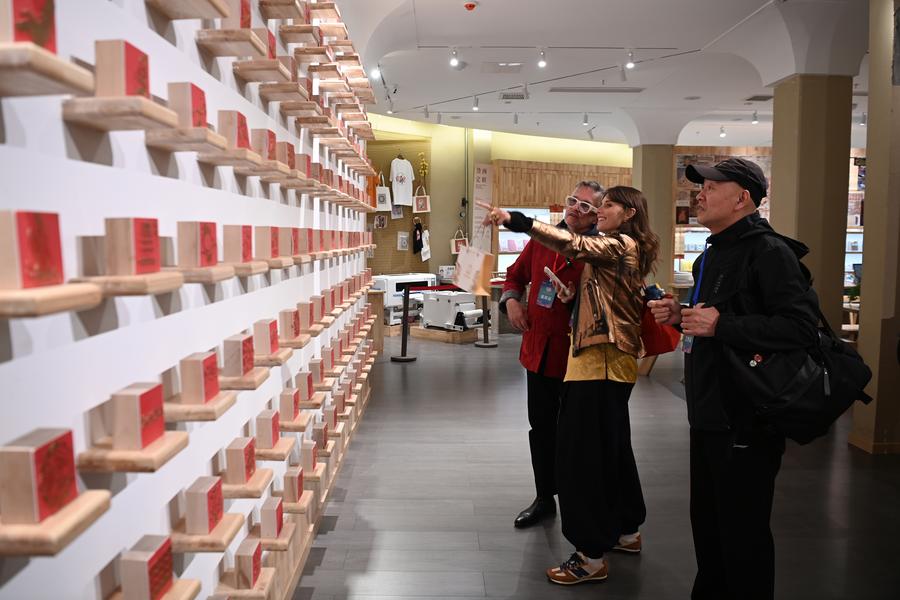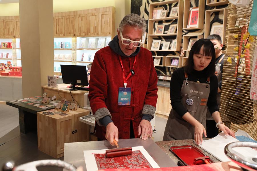 11日、敦煌印局で手作業による印刷を体験する海外からの来賓。(敦煌=新華社記者/張睿)