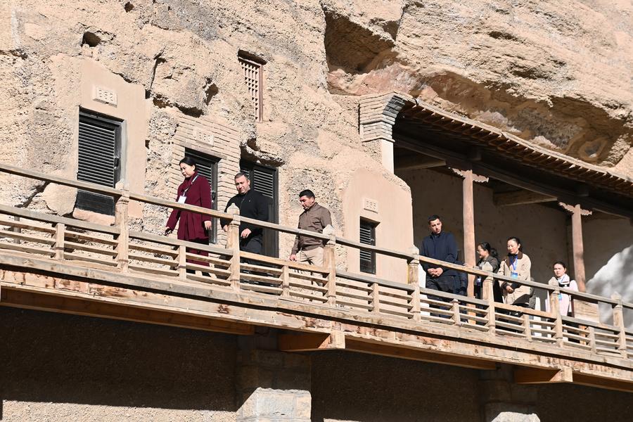 【新華社敦煌10月13日】中国甘粛省敦煌市で11、12両日、アルメニア、イタリア、トルコ、ネパールなどから訪れた来賓らが市内にある世界文化遺産・莫高窟(ばっこうくつ)や文化施設「敦煌印局」、今秋オープンした文化・ファッション施設「敦煌無界」などを見学した。一行は「世界市長対話・敦煌」の出席者で、地域の歴史と豊かな創造性を体感した。