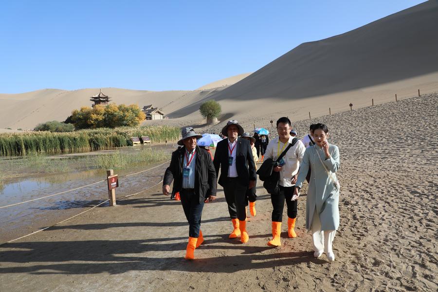 12日、敦煌市の鳴沙山・月牙泉風景区を訪れた海外からの来賓。(敦煌=新華社配信/王生元)