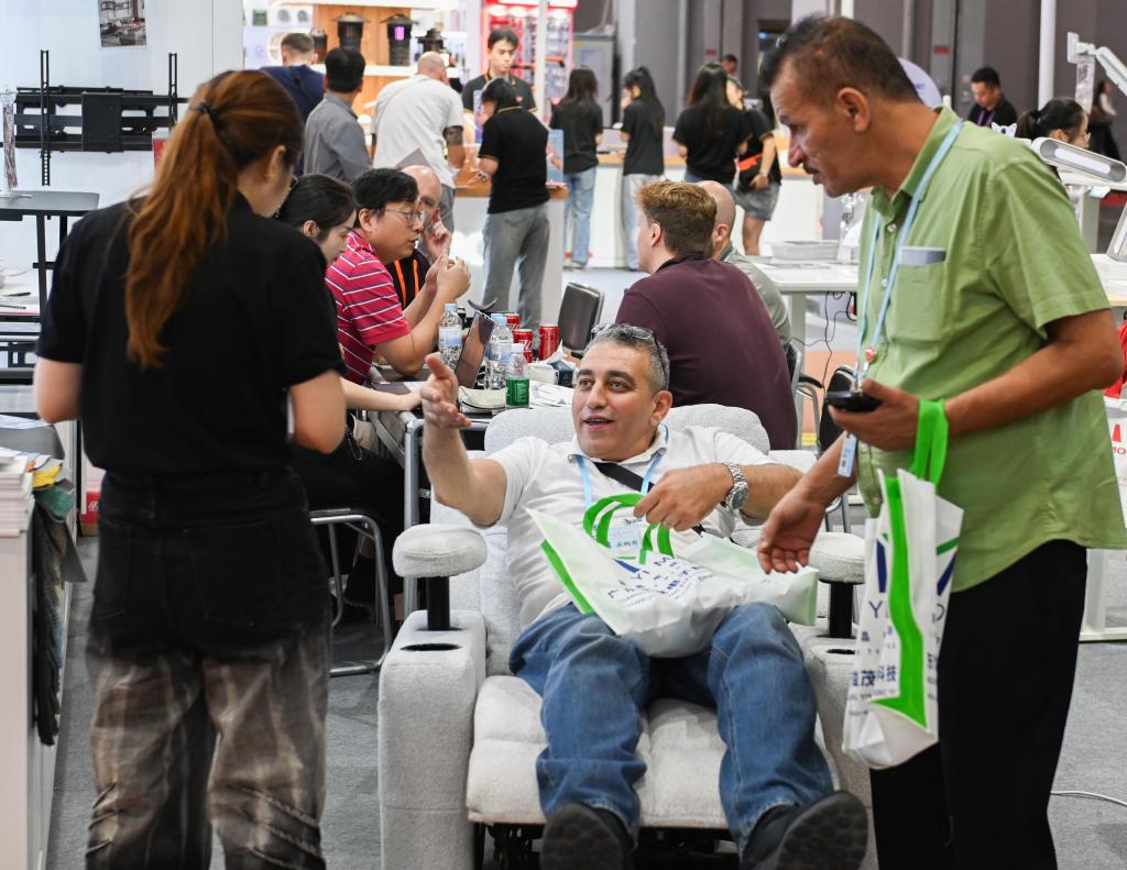 15日、第138回広州交易会で人間工学チェアを体験するバイヤー。(広州=新華社記者/肖恩楠)
