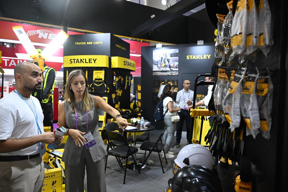 15日、第138回広州交易会で、米工具メーカー、スタンレー・ワークスの展示エリアを見学する海外バイヤー(左)。(広州=新華社記者/鄧華)