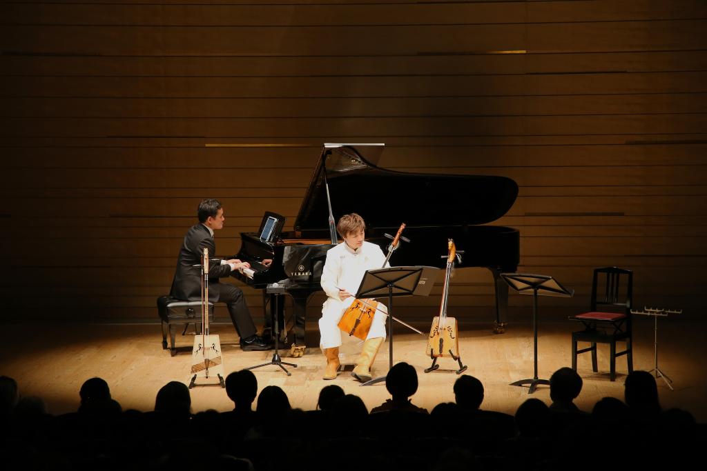 1日、記念コンサートで馬頭琴を演奏する賽音吉雅氏。(東京=新華社記者/岳晨星)
